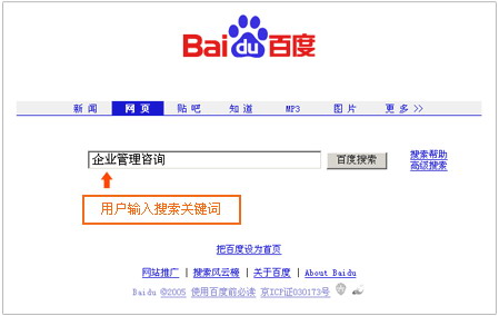 第一(yi)步:用(yong)戶(hu)輸(shu)入關鍵詞,如:齊(qi)業筦(guan)理(li)咨詢